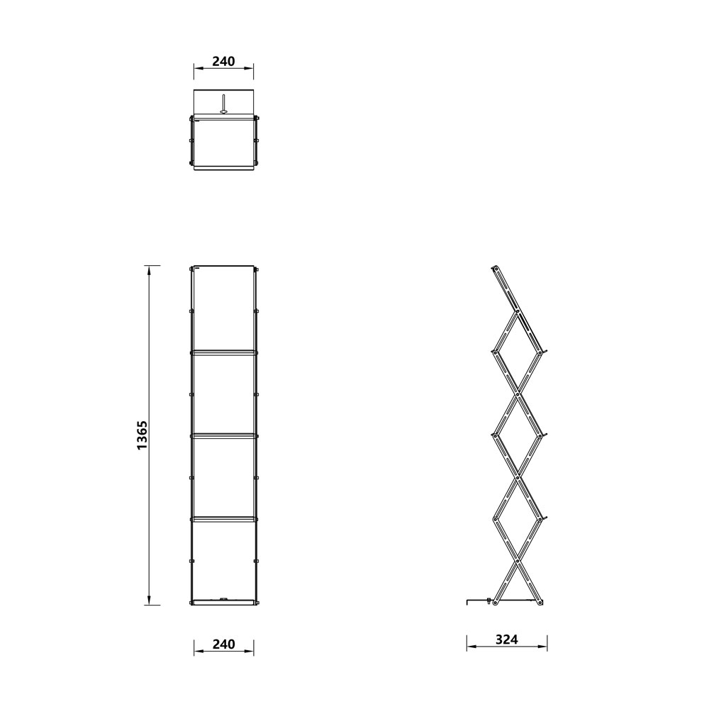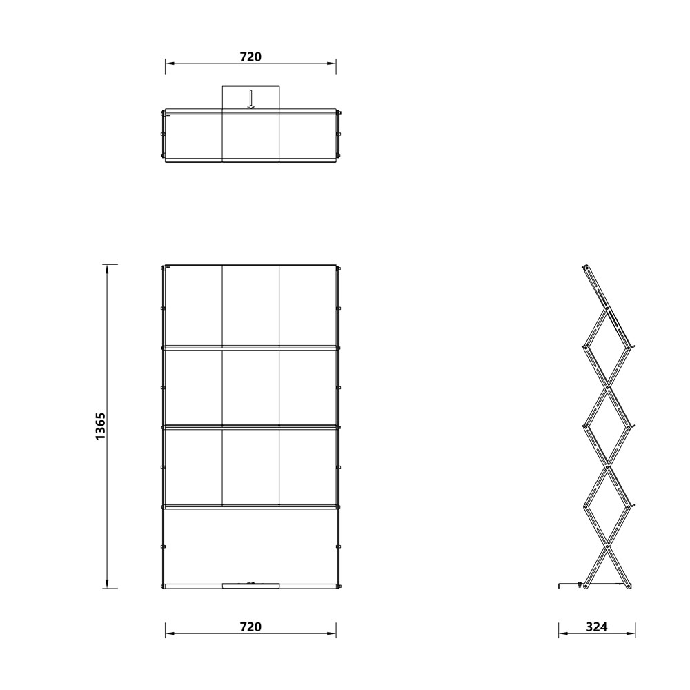 Disponível com 3-6-9 bolsas para catálogos, é muito fácil de montar, autoportante e modular.
