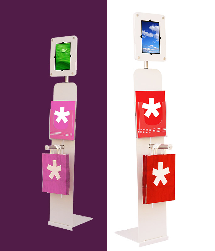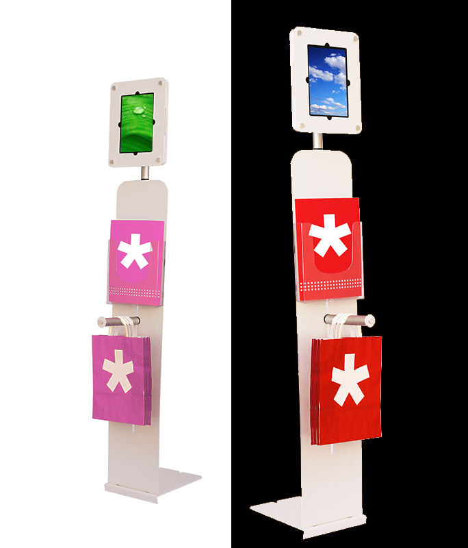 Novo modelo de contacto 2019 da Fastand. Fácil de transportar graças à mala rígida. Cabeça do suporte para tablet giratória. Pintura branco total. Suporte para tablet universal.