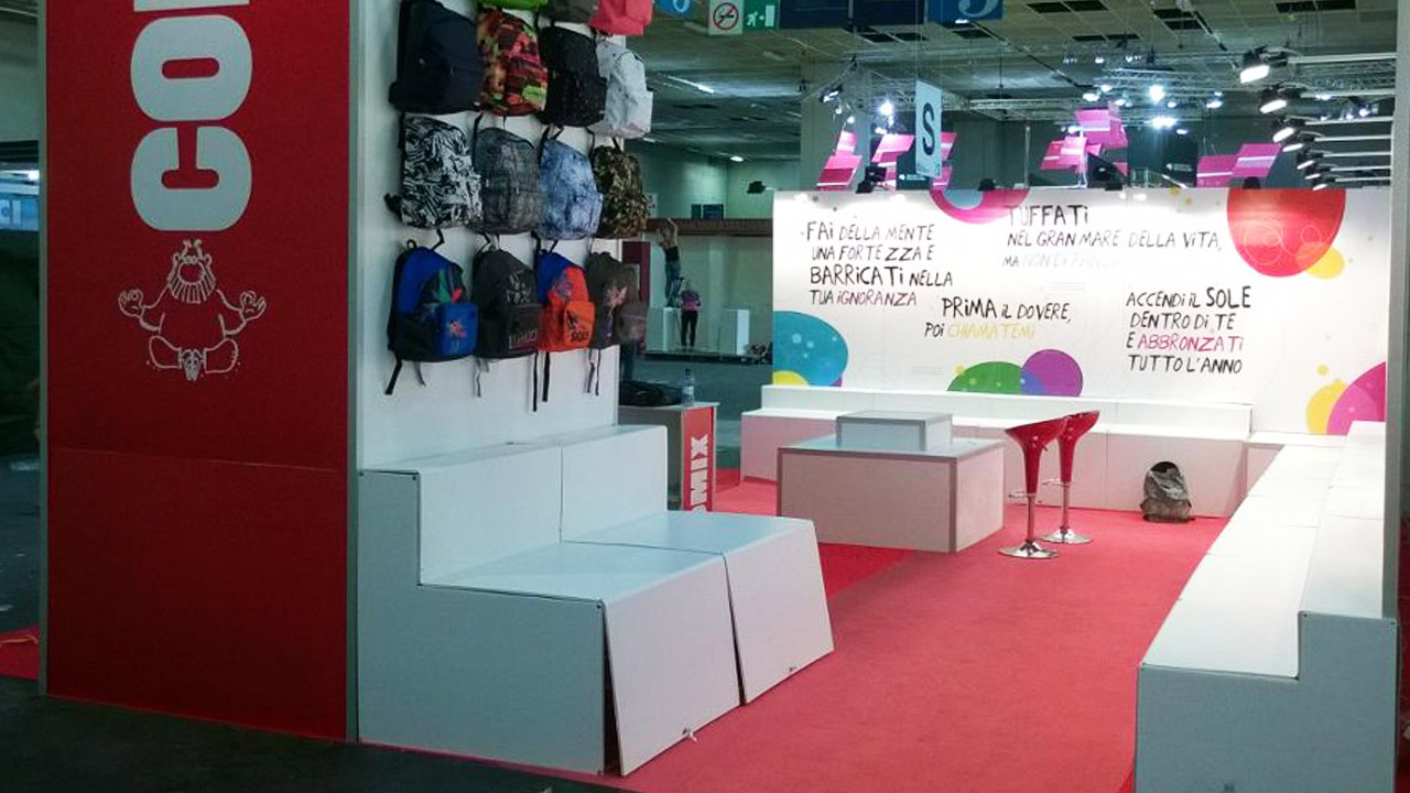 Stand modular e componível para a Feira do Livro de Turim, concebido para Cosimo Panini, com uma torre de 5 metros de altura destinada a servir de espaço de armazenamento. Ao longo de todo o perímetro, criámos uma série de expositores com compartimentos que se abrem, onde se podem guardar livros durante o evento. A estrutura é em alumínio e o revestimento em Fastflex.