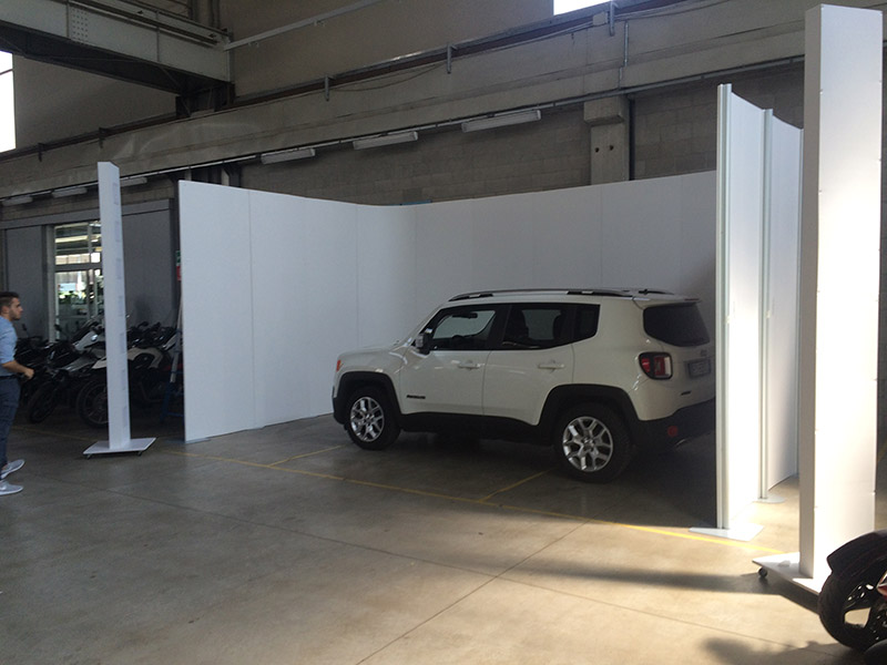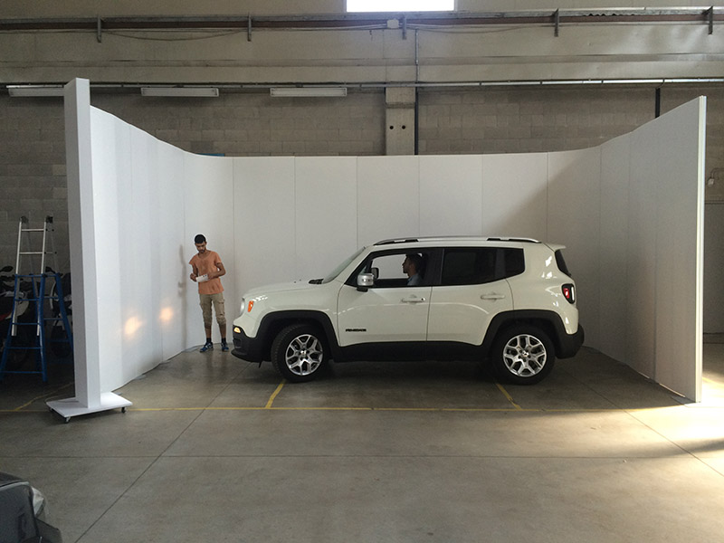 Este conjunto fotográfico para automóveis, permitindo a entrada de um automóvel para depois ser fotografado. As luzes LED também são móveis sobre rodas.