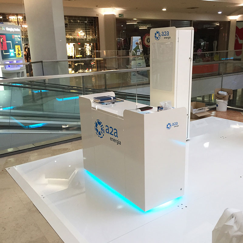 Como de costume, trata-se de um stand clean, sóbrio e elegante, caracterizado pelo predominância da cor branca e pelo efeito de acabamento brilhante das suas superfícies. Visto do exterior, aos olhos de quem passa, parece realmente um stand normal de centro comercial, mas na verdade é um Fastand. Assim, cada elemento encaixa-se noutro.