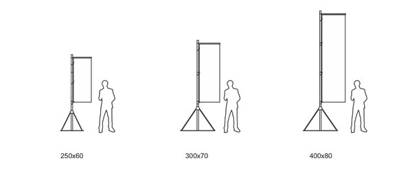 A bandeira para exterior tem a forma de uma gota, com um design arredondado; a base giratória garante o seu bom funcionamento mesmo em condições de vento forte. Estão disponíveis vários tipos de bases e acessórios para fixar a bandeira.