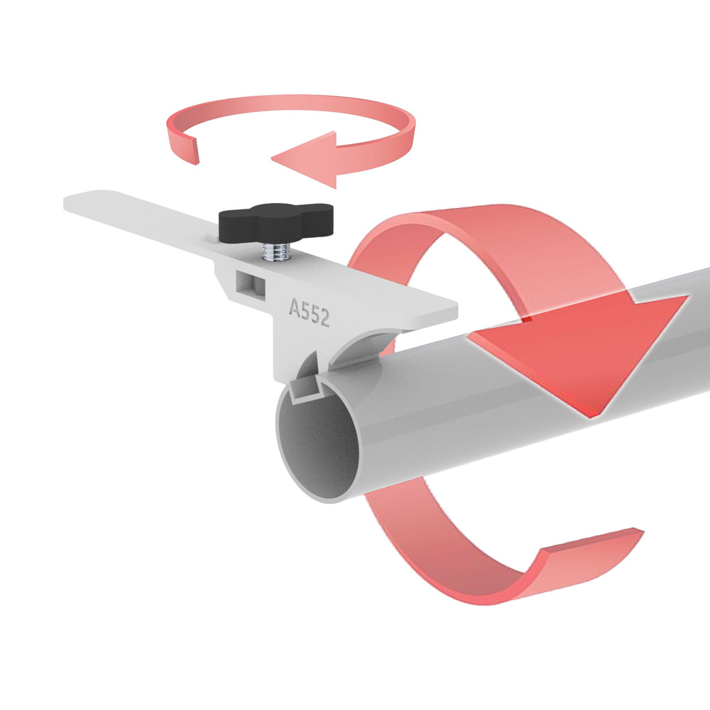 É portanto substituído o clássico gancho em metal por este sistema de corrediça. A característica é que ao deslizar para a frente entra no travão do tubular bloqueando a rotação, mas além disso é também utilizado durante a utilização do roll-up para poder decidir e gerir a inclinação da lona gráfica permitindo precisamente um resultado perfeito do display e uma absoluta perfeição formal.